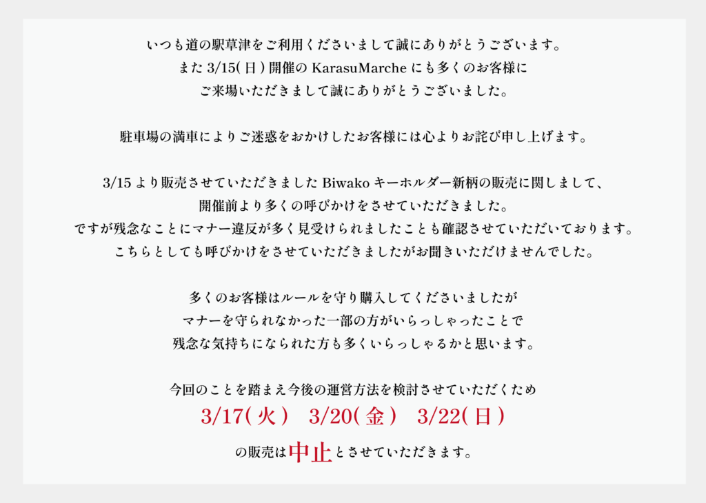 いつも道の駅草津をご利用くださいまして誠にありがとうございます。