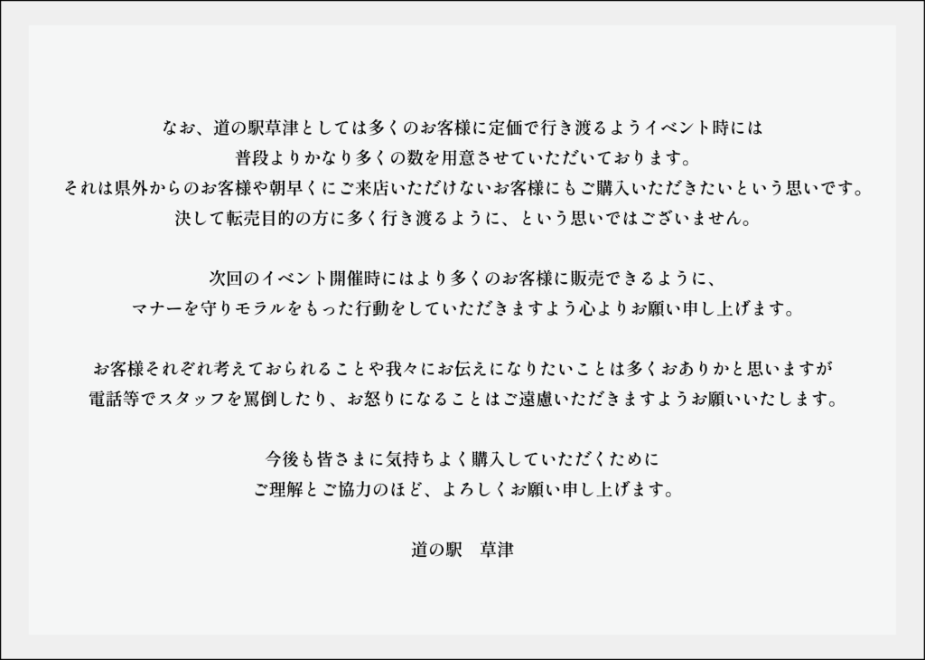 なお、道の駅草津としては多くのお客様に定価で行き渡るようイベント時には