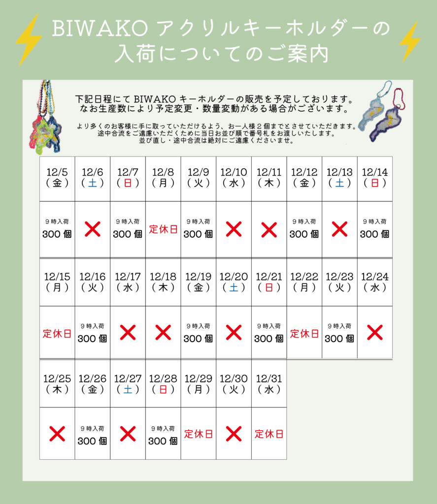 Biwakoアクリルキーホルダー販売カレンダーにつきまして