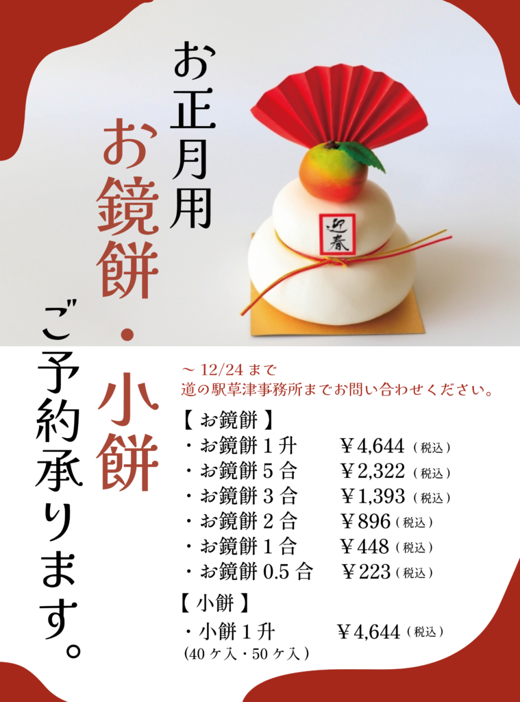 いつも道の駅草津をご利用くださいまして誠にありがとうございます。ただいま道の駅草津では12/24(水)までの間『お正月用 お鏡餅・小餅のご予約』を承っております!道の駅草津内の入口入ってすぐに見本もご用意しておりますのでサイズに悩まれているお客... -