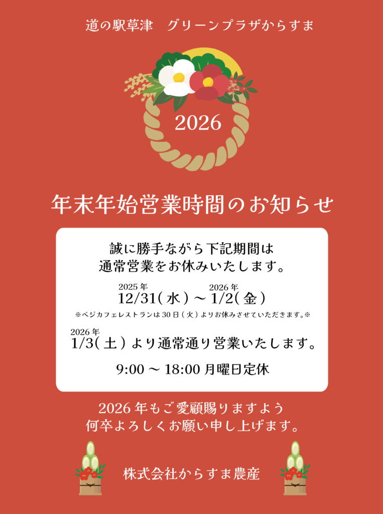 いつも道の駅草津をご利用くださいまして誠にありがとうございます。 年末年始の営業日に関しましてお知らせさせていただきます。2025年12月29日 月曜日のため定休日2025年12月30日 年内最終営業日 9:00~18:00 (vegeカフェレストランは休業させていただ... -